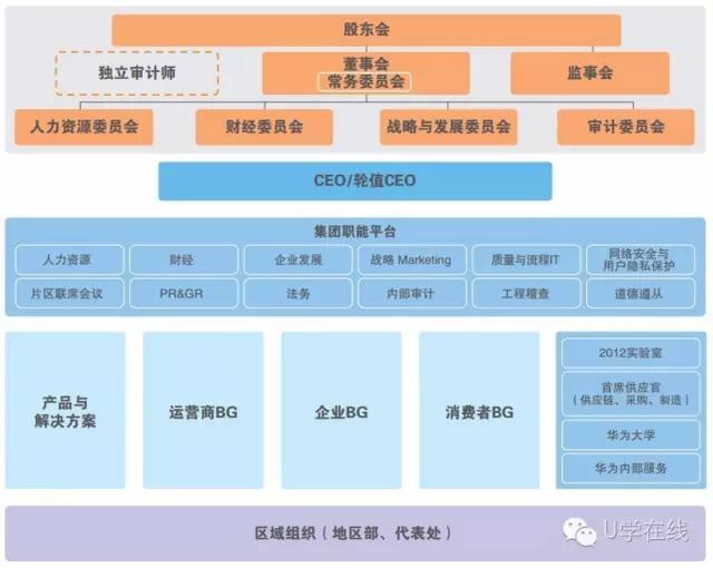 董事会:是华为战略和经营管理的决策机构,对公司的整体业务运作进行指导和监督,对公司在战略和运作过程中的重大事项进行决策。董事会下设人力资源委员会、财经委员会、战略与发展委员会和审计委员会,协助和支持董事会运作。