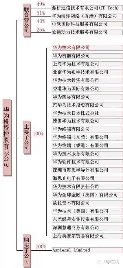 一般来说,控股一家公司只需要占该公司股份50%以上即可,过去U学在线整理的中国移动、中兴通讯等公司,对其下属不同子公司的持股比例各不相同。而没有上市的华为对其下属所有子公司都是100%控股。