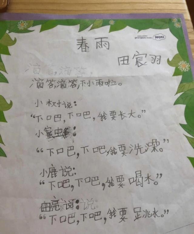 田宸羽的字迹端正带有稚气,诗的名字叫《春雨》,描述了“小树”“小蜜蜂”“小鹿”等动植物接受春雨洗涤的状态,童言童语的模样甚为有趣,看得出来田宸羽非常热衷关注大自然,这离不开田亮开放的家庭教育。