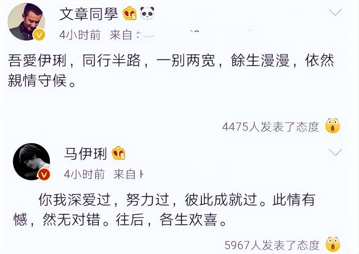 因为2019年7月28日,就在姚笛公布婚讯的同一天,马伊琍和文章也官宣了离婚的消息。