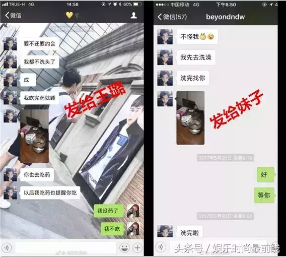 从晒出的截图来看,和王璐聊天说吃完药就睡,然而一转脸却和妹子约会:洗完找你