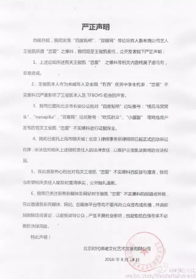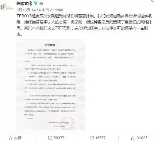 而这次TFBOYS组合所属公司@峰峻文化也发出了声明!