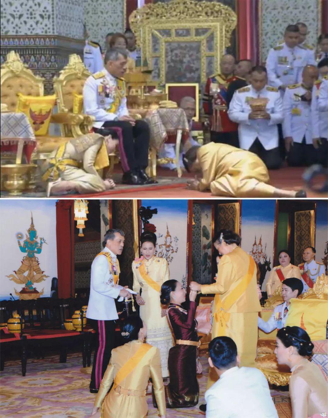 刚刚结婚4天的新婚妻子苏提达一直未得到正式受封,所以她的王室身份要低于玛哈国王的公主姐姐和妹妹。在昨天的加冕仪式会面上,苏提达还向诗琳通公主施行跪拜礼。今天,新国王正式册封自己的新婚妻子为“玛哈王后千岁殿下”。苏提达伏地跪拜了老公之后,终于坐上了自己的“凤椅”宝座。