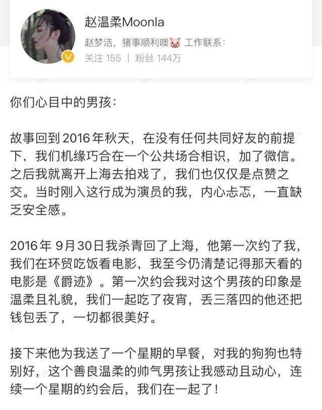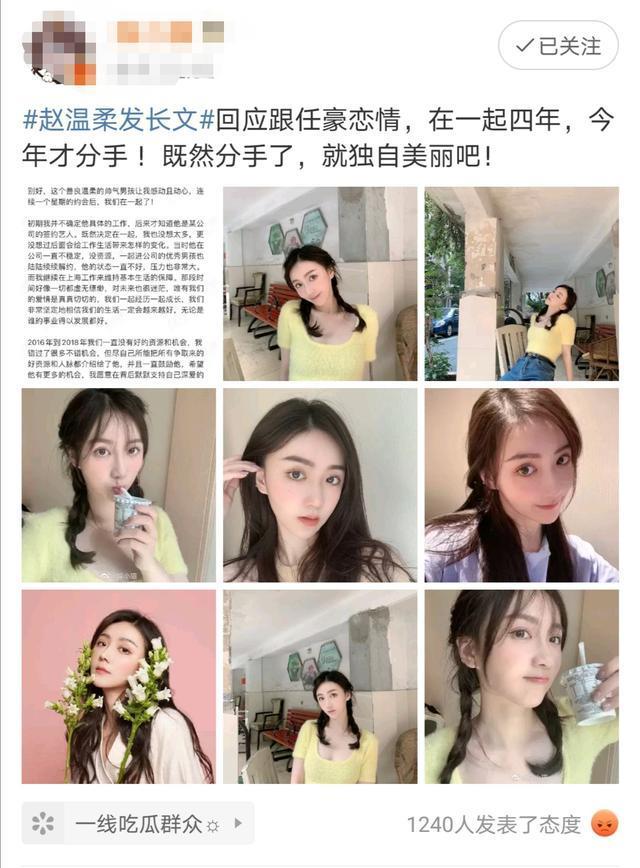 14日深夜,任豪的前女友赵温柔发了一条很长的微博来回应他与任豪的恋情。从内容来看,他们都已经在一起四年之久了,起初是任豪追的女方,女方是和他在一起之后才知道他是某公司的签约艺人。