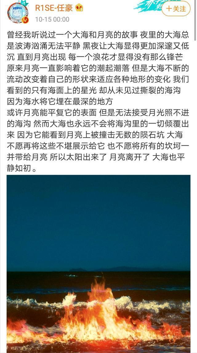 任豪在半夜发文讲了一个大海和月亮的故事,疑似在回应这段恋情。