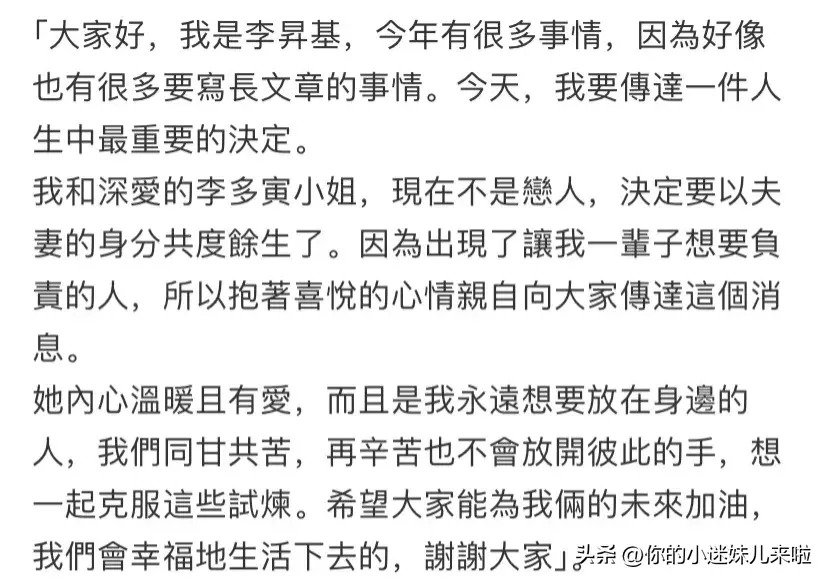 就这样,李昇基在公布恋情被粉丝反对后还发长文为妻子“叫屈”。