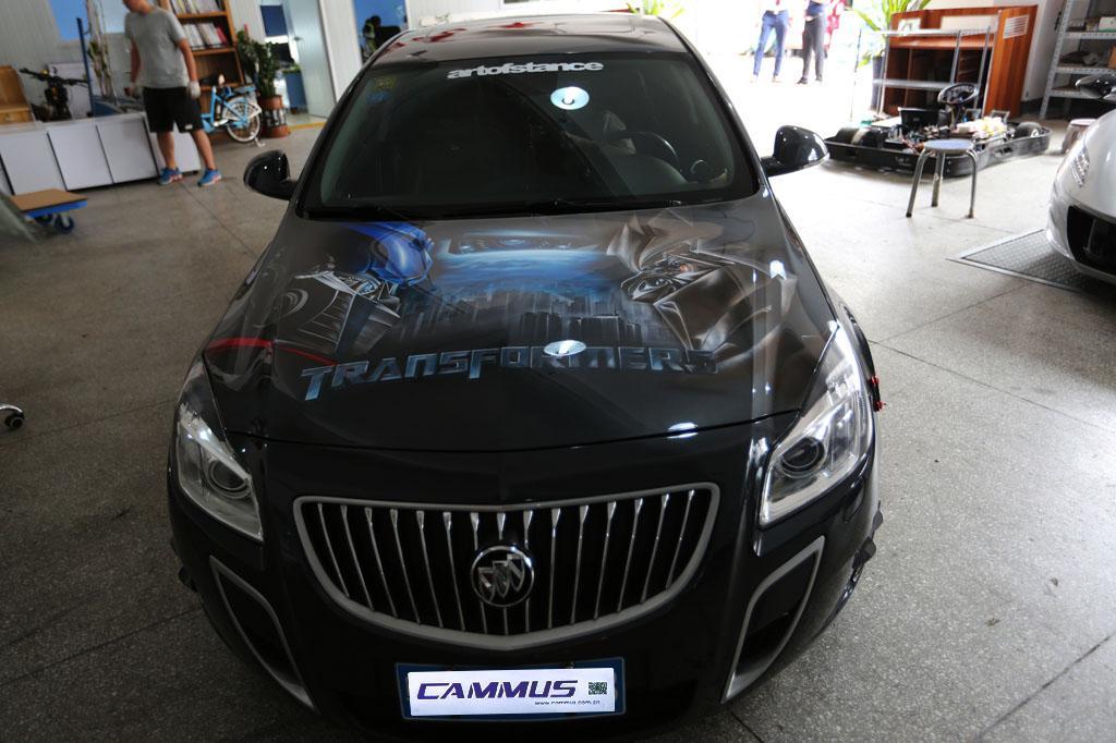 外观部分最迷人的自然是车身的发动机盖大面积3D拉花,这在卡妙思改装案例中鲜少见到,而这个效果源自3D的拉花贴膜处理。远看彷如静卧的黑夜魅影,近看也有值得仔细品味之处。这和大街所见清一色的君威GS相比,确实让人眼前一亮,也属车主的明智之选。