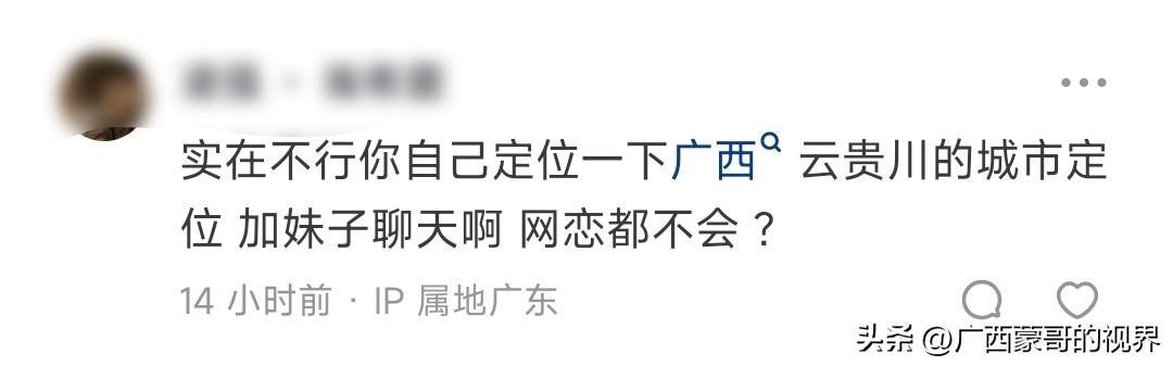 有个外省人在他们当地找不到老婆,有网友给他支招,让他去越南、广西、贵州找女孩,还说把自己定位到广西、云贵川的城市,加妹子聊天,先网恋。