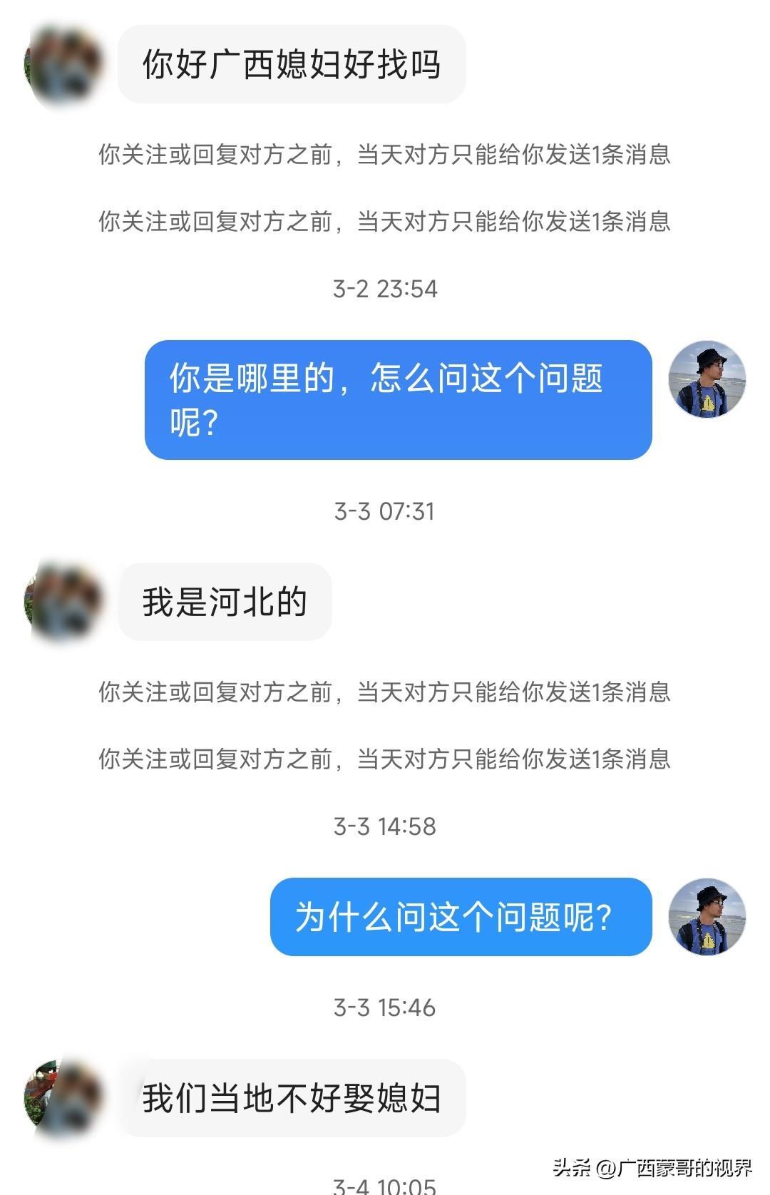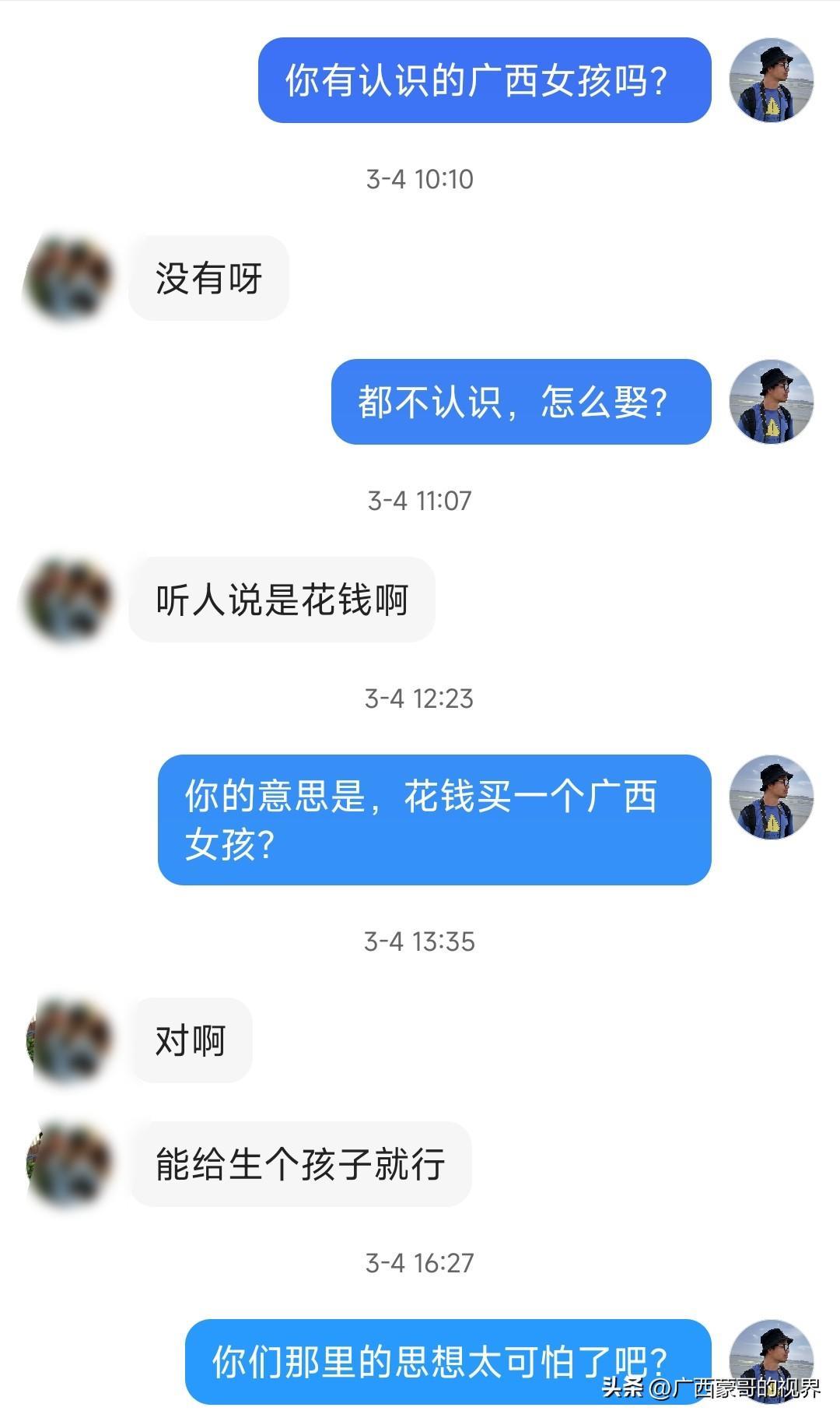 之前我也收到过一封私信,有一位外省网友在他们当地找不到老婆,然后问我广西媳妇好不好找,他听人说在广西可以花钱买一个,他的要求是能生小孩就行了,我觉得他的思想太可怕了。