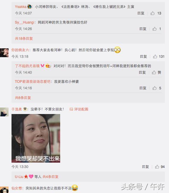 “小河神的时分完全被圈粉啊 演技在线 超级喜欢他 我找不到像李现这样的高富帅 那就默默挣”“李现!!!!!!我熊看了河神就特别喜欢的男神!!!!!!!瘦的和她对象一样不过我爱的是女人”。