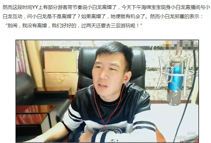 但最终两人还是走到了分手离婚的地步,两人甚至还因为孩子的事情闹上法庭。当时这件事也是YY上的热议话题,那段时间小白龙也是身心疲惫。