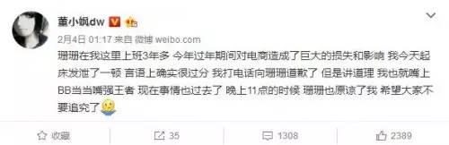 当小编拿着小板凳静静的等着事情继续发展下去的时候,董小飒又发了微博表示对于自己语言上的攻击已经向刘珊珊道歉了,当事人也原谅了他......what?事情就这样结束了???