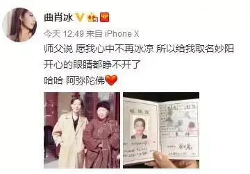 曲肖冰手持皈依证为证,的确入了佛门,不过法名亮了“妙阳”,仅仅一个谐音字又被粉丝议论与仙洋有异曲同工之妙,都是过去事了,既然曲肖冰已入佛门就是想寻求一丝清静,也希望粉丝们不要再带节奏啦。