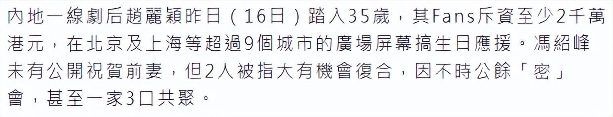 虽然外界各种猜测赵丽颖和冯绍峰可能复婚,但是在赵丽颖昨日过35岁生日时,冯绍峰并没有任何表示,没有发微博为赵丽颖庆生,赵丽颖的粉丝则花重金在多个城市的大型广场的巨型屏幕上播放应援短片为她庆生,每天播120次,一共播两天,至少花费了1832万元。