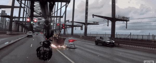 《特技狂人》充斥着险象环生的追车、会车镜头,隐约透出致敬《速度与激情》系列的影子,其中一段街头追车戏,让人不禁联想起保罗·沃克从飞驰的列车跃向全速前进跑车的经典片段。