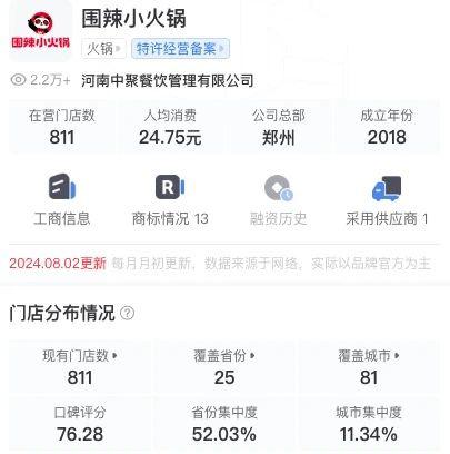 围辣小火锅是小火锅品牌中在近两年扩张最快的,根据窄门餐眼显示,围辣目前已有 811 家门店,覆盖 25 个省份。