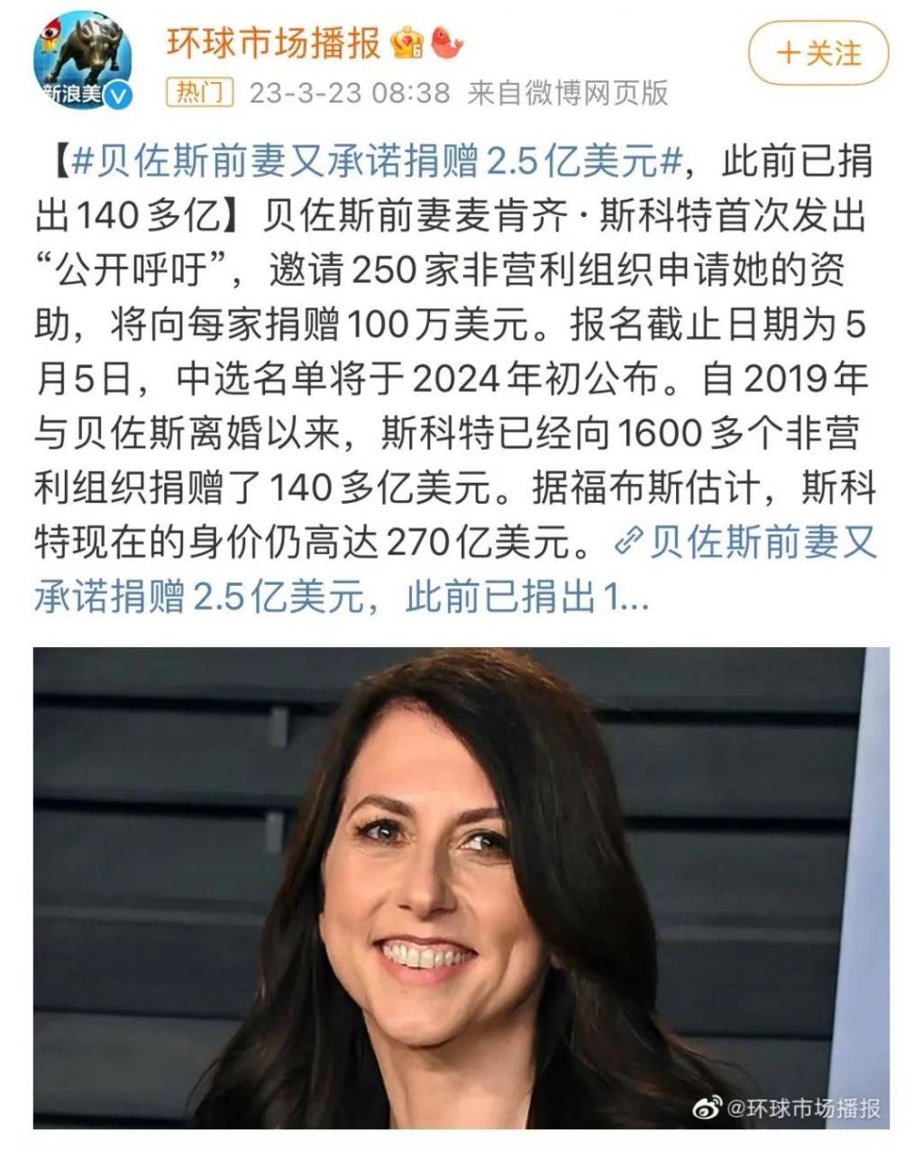 双方的离婚都非常顺利。与贝佐斯一起创立亚马逊的前妻麦肯齐拿到 270 亿美元的资产,跃居全球女富豪 top 级。但身为知识分子的她对于财富不感兴趣,到今年上半年,已经拿出 140 亿美元去做慈善。
