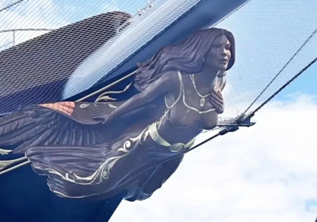 船头花费重金打造的祈福雕像用的是桑切斯本人的形象,而贝佐斯造这艘游艇正是为了跟桑切斯一起环游世界。