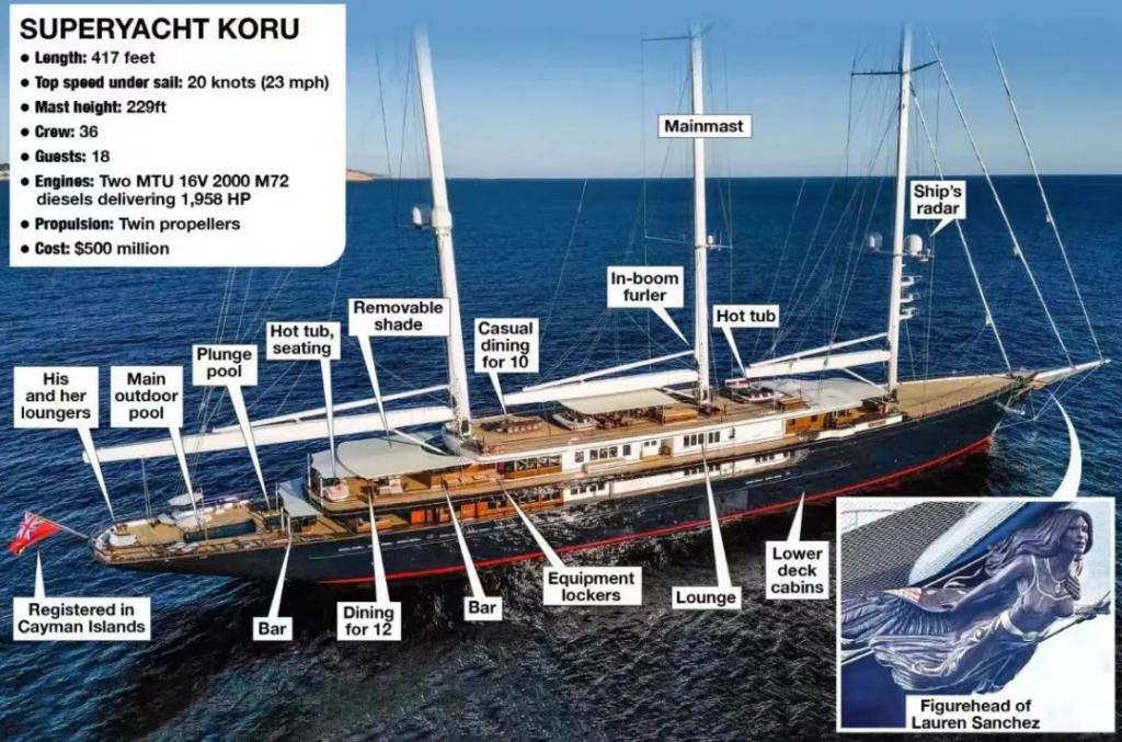 这艘超级游艇 2025 年开始制造,取名 "koru",毛利语意思为 " 新的开始 ",显示了首富换个老婆、换种活法的决心;