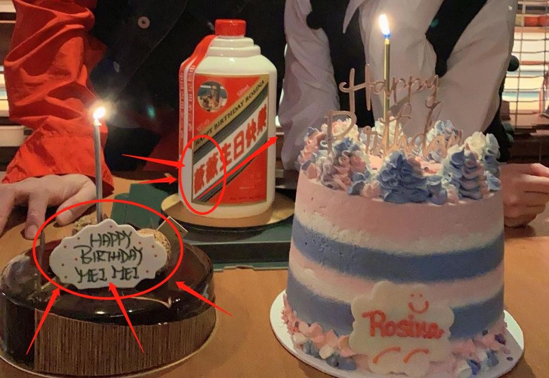 二人面前摆着三个蛋糕,其中一个乍一看像是一瓶白酒,仔细看过才发现是特意定做的蛋糕,上面还写着“薇薇生日快乐”;另一个蛋糕上则写着“MEI MEI(妹妹)”的字样,似乎是作为兄长的林峰特意买的。