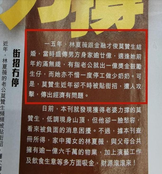 2015年7月,林夏薇在香港山顶一座豪宅与莫赞生完婚,场面相当隆重,据说当时轰动了香港娱乐圈。没想到,自此后她就开启了“一地鸡毛”。