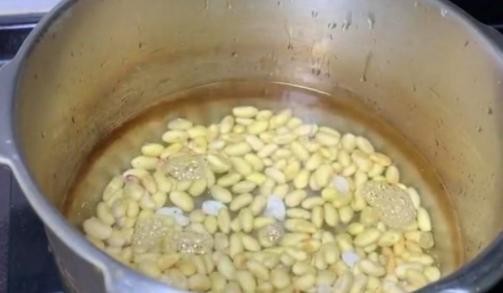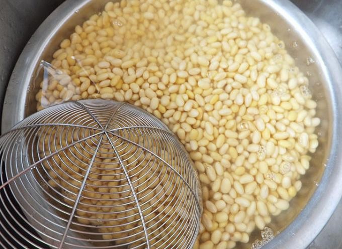 然后我们来处理食材:黄豆我们一定要隔天晚上泡好,这样第二天才能够用,不然的话,黄豆就不容易煮熟,浸泡的时候,最好能给黄豆换一两次水,如果觉得这样比较麻烦,我们可以把黄豆洗净后放在冰箱中浸泡一个晚上,这样的话我们可以省略换水这个步骤,不管怎么选择,我们浸泡黄豆的时候最好是一个晚上以上。