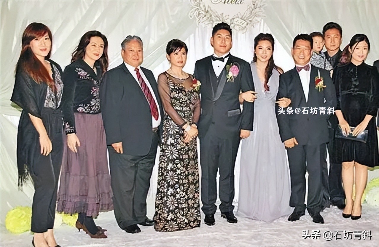 洪金宝、高丽虹夫妇带着儿子及儿媳还有孙子和元彪、彭秀霞夫妇以及女儿和新郎一起合影