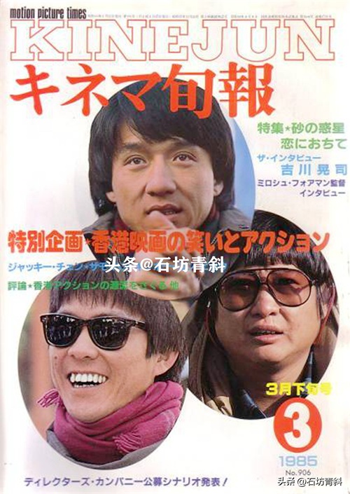 1985年3月下旬号《电影旬报》封面,以香港三大动作明星成龙、洪金宝、元彪作为封面介绍当年香港动作片