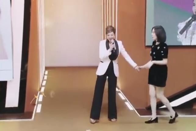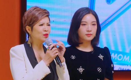 女儿眼眶含泪,从沙发上起身走上舞台,牵着妈妈的手,陪妈妈唱完这首歌。
