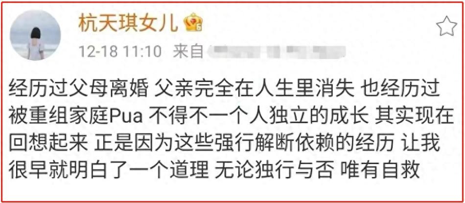 杭天琪看到女儿的发文,在家里掉了一夜眼泪。