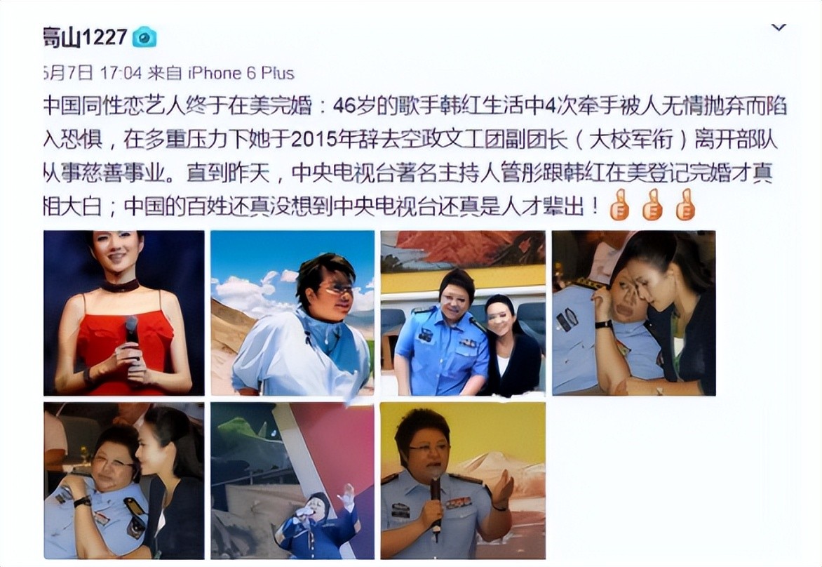 当时突然网上突然有了很多传言,说管彤已经和韩红在美国领证结婚了。
