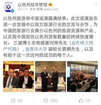他和以色列驻华大使、旅游部部长一同出席活动,官方在一条非常严肃的微博上@“吉林土特产代购”,大家还以为@错了账号。