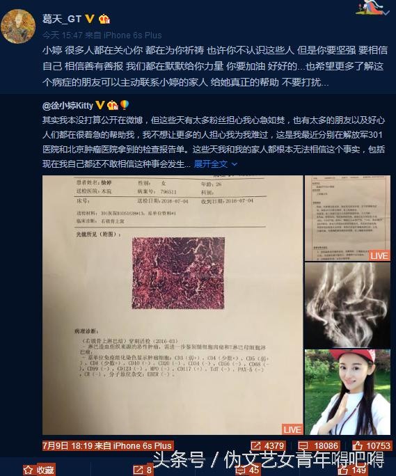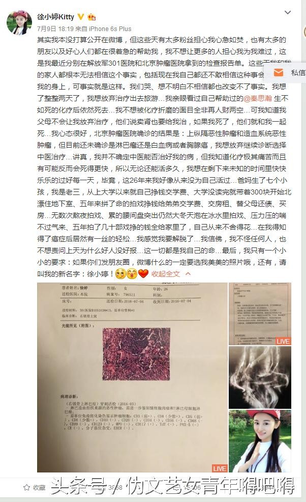 在徐婷的置顶微博里,介绍了自己的患病情况,以及她不想让家人和朋友、粉丝担心的心声。并在最后给自己起了一个新名字——徐小婷。