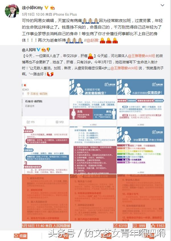 网易女编辑离世的时候,徐小婷也曾转发微博说“钱是挣不完的,命是自己的”。