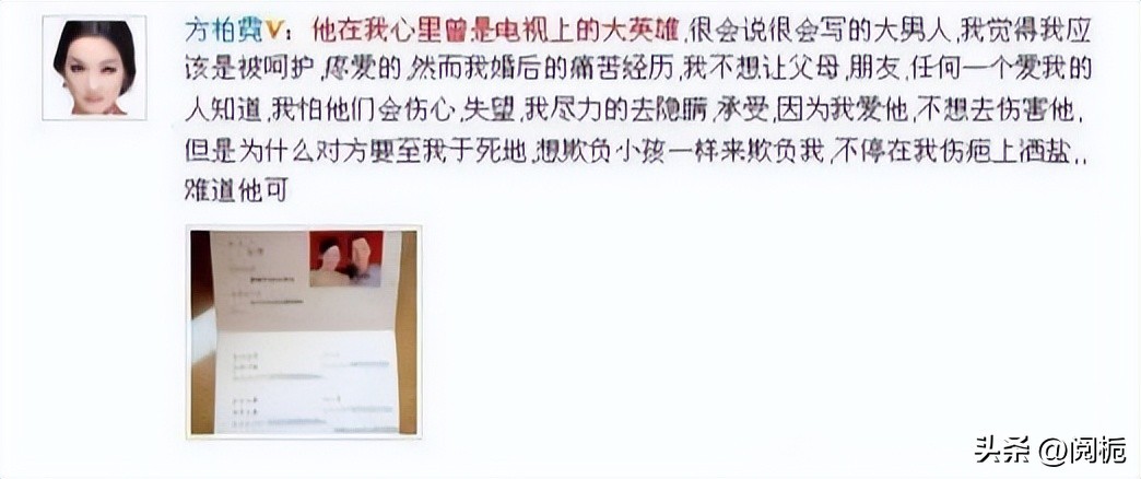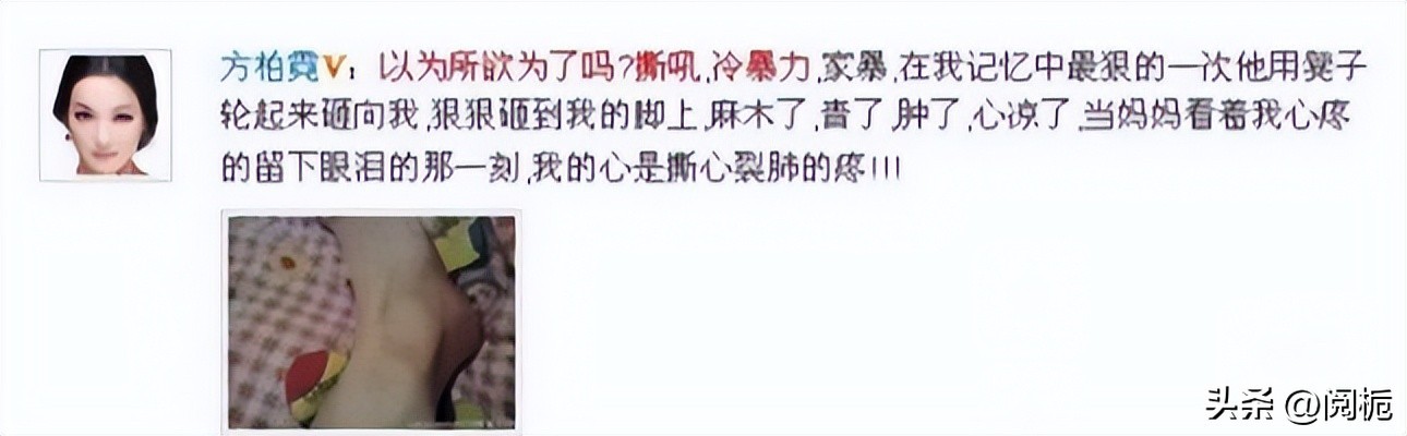 “家暴”是于震的一段黑历史,他的第一任妻子方柏霓曾公开控告他家暴,他将凳子抡起来狠狠砸向她的脚,以至于流产。
