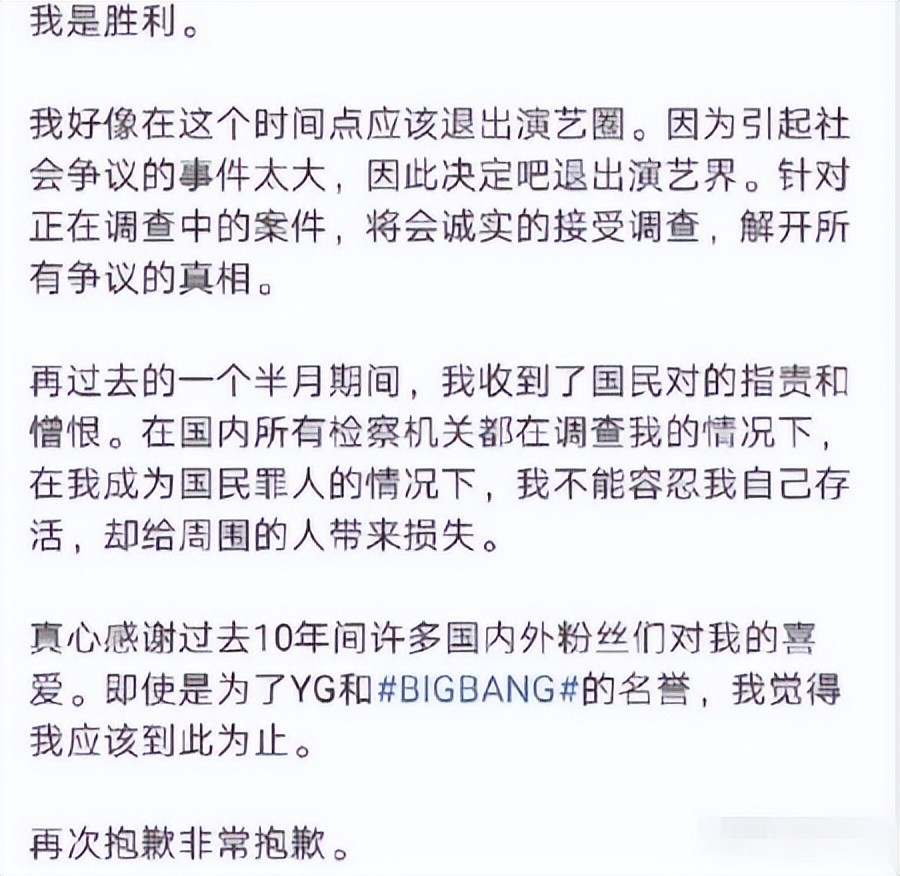 3月11日李胜利宣布退出娱乐圈,并表示将继续接受警方调查。(其中还涉及吸D,在此不便详细写,感兴趣的朋友可以搜索一下)