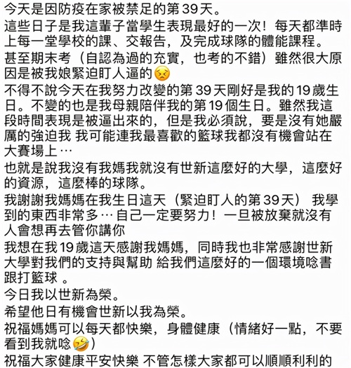 对邱黎宽的付出,邱煌祎感恩在心,他曾在19岁生日那年写下了长文,其中提到最多的就是感谢邱黎宽。