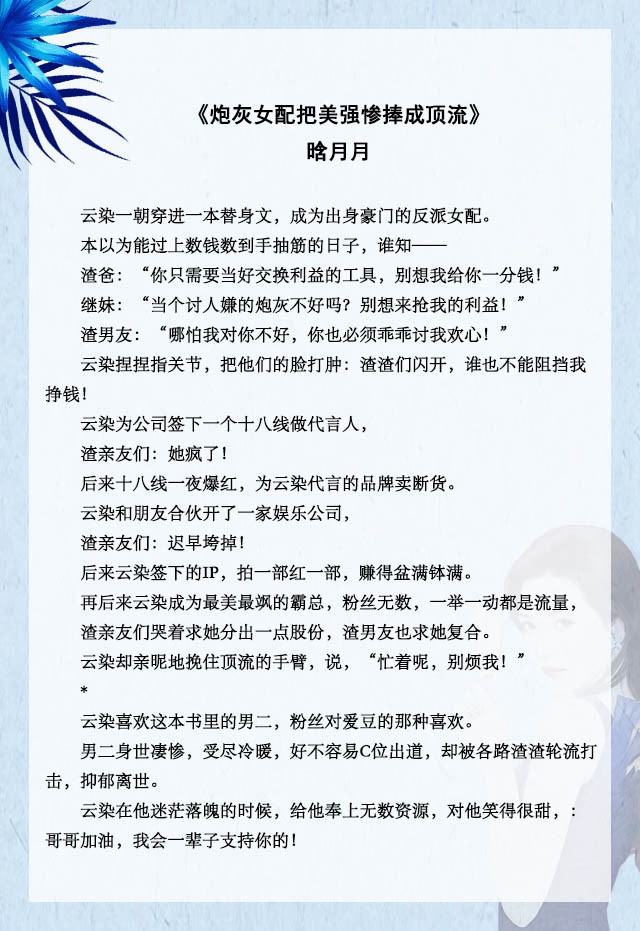 原主为爱黑化后做尽坏事,被原男女主联合吊打,下场凄惨。女主穿越在原主想向原男主献身之际,她果断踹了渣男主,以免像原主一样赔上前途和性命。男主是原书中的美强惨男二,受尽各种非人般的遭遇,未来还会被黑化后的原主设计陷害,抑郁而终。女主在看小说的时候就很心疼他,穿书后果断送他各种资源,一路将他捧成了顶流。男主也很争气,让女主的公司赚得盆满钵满。打脸剧情看着解气,言情线也很治愈,可以阅读。