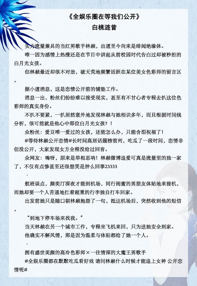 短评:现言,暗恋,娱乐圈,久别重逢。女主是拥有300万粉丝的专业色彩师,算是小有名气的网红,性子稍微有些呆萌,正经中透着一丝可爱气息。男主是国内一线创作男歌手,暗恋女主多年。在男主还是个名不见经传的校园乐队主唱时,曾向女主表白过,被女主秒拒,爱而不得的男主惦记了女主很多年。女主后来的闺蜜是男主的死粉,因为闺蜜的神操作,男女主再次有了交集,男主花式追妻。