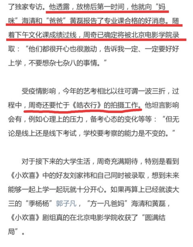 00后新生周奇也在开学当天现身北电校门, 他在今年的北电艺考中名列第九。此前,周奇在电视剧《小欢喜》中和黄磊海清饰演一家人,如今三人已成为北影校友。在接受媒体采访时,周奇隔空喊话海清:“妈,我来了。”