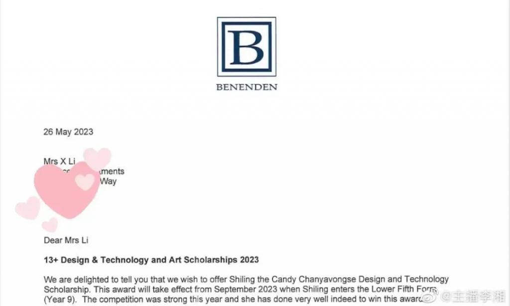 这个奖学金主要用来奖励在艺术、体育、戏剧、设计等方面有杰出表现的学生。而在学校发给李湘的邮件中,明确写道: