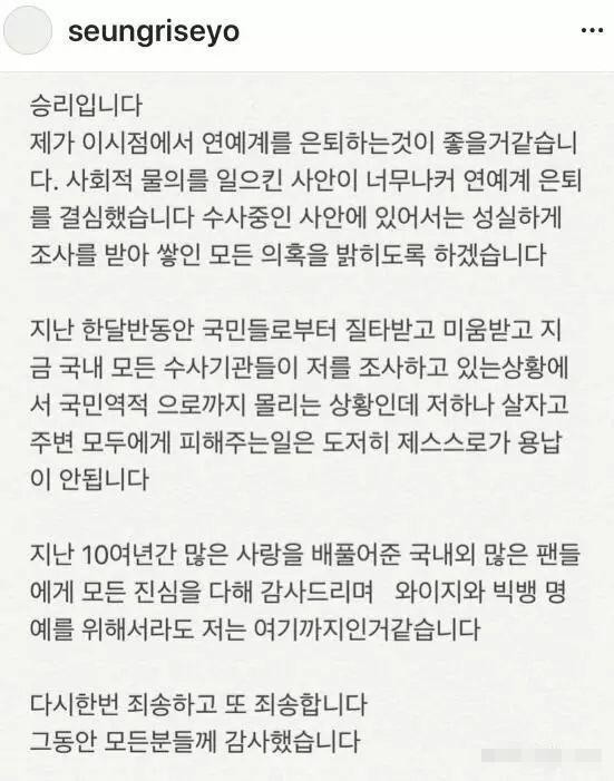 2019年李胜利事件震惊全韩,超过24万韩国民众请-愿彻查。