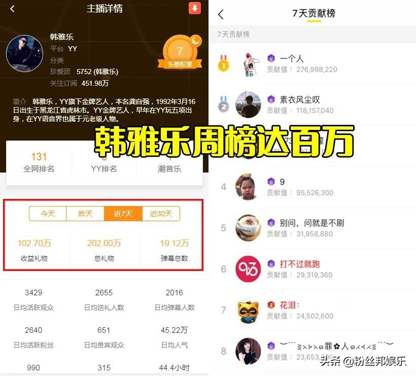而对于韩雅乐最近成为YY唯一的“百万周榜”主播,有粉丝调侃他这是纯纯的用“公会号”自己顶榜单。