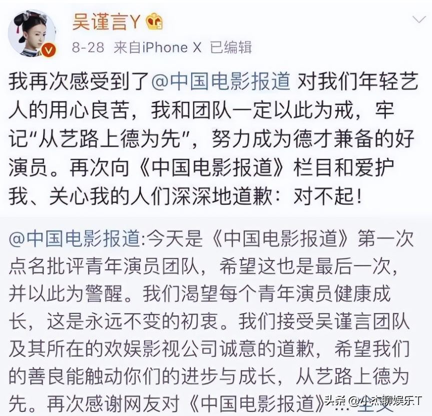 吴谨言这边也迅速发布了道歉信,