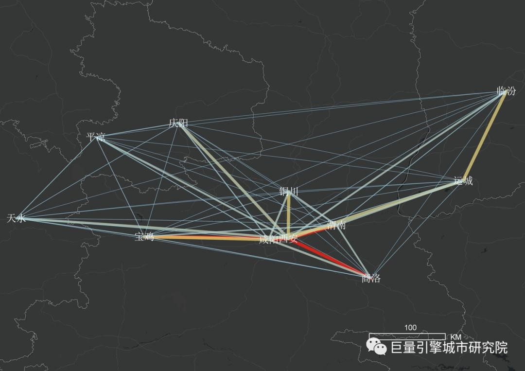 关中平原城市群抖音用户跨城市流动打卡示意图