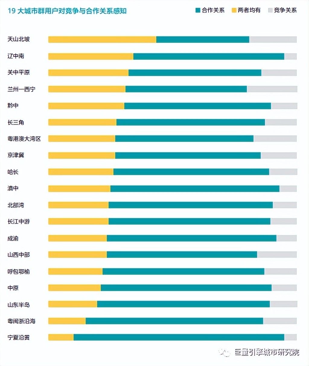 在面对城市群内部发展差异较大时,在竞争中合作协同发展可能是未来持续发展过程中弥合发展差异比较有效的方式之一,关中平原城市群的用户对此也持有相同的看法。据2021年5月巨量算数抖音用户调研数据显示,关中平原城市群有31.09%用户认为城市群各个城市是合作关系,位列19大城市群第三,希望相互合作与包容能够带领城市群整体向前发展;更有54.10%的用户表示竞争与合作二者皆有,形成互为竞争又彼此合作的关系能够相互扶持与促进各个城市加速实现更加美好繁荣的目标;较少的比例说明城市群彼此协同发展的理念已经深入人心。