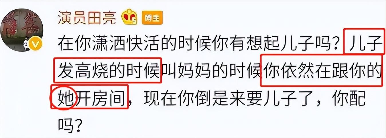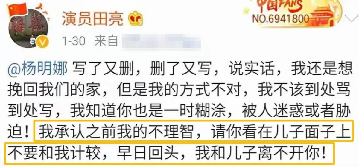 一天,田亮在微博上公然发表了对杨明娜的指责,田亮甚至还说要为自己的儿子讨回公道。