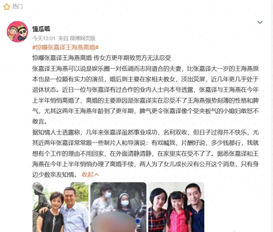 最近娱乐圈又炸锅了!张嘉译和老婆王海燕要离婚的消息满天飞,搞得大家都人心惶惶的。说实话,我第一反应是:不会吧不会吧,这对模范夫妻也要完蛋?咱们先别急着下定论,来看看到底咋回事。