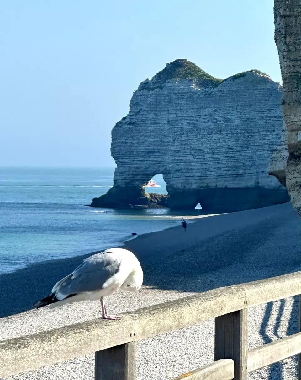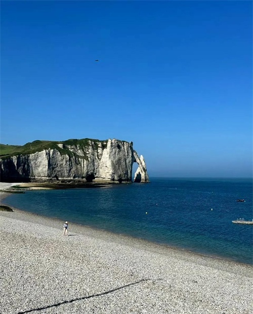 查了一下,埃特勒塔象鼻山位于法 国诺曼底大区滨海塞纳省的埃特勒塔小镇。因其形状酷似大象的鼻子伸入海中而得名,是一个很不错的旅游圣地。当地的温度只有22度,正适合游泳。