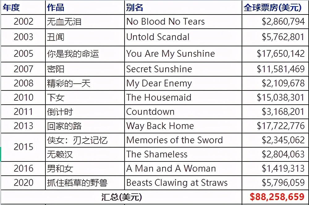 票房统计数据可能存在遗漏或疏漏之处,以下票房统计的电影会对应奖项栏下的获奖电影,有的电影存在于百度百科介绍但是在boxofficemojo查询不到票房数据,故本文只统计全度妍在互联网上能够查询到的出演电影票房。【注:票房数据源自boxofficemojo】